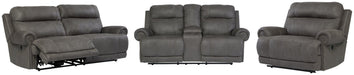 Sparing that "puffy" look you might expect from a recliner, this reclining sofa and loveseat set doesn't hold back when it comes to contemporary style. Subtle touches such as sporty jumbo stitching, nailhead trim and a "weather worn" effect on the upholstery give this handsome set a buttoned-up appeal and fresh feel. Loveseat’s center console with dual cup holders brings a handy element to the arrangement.