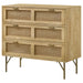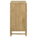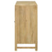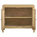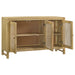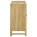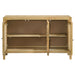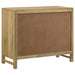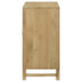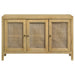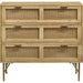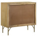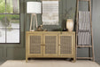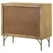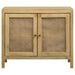 Place this transitional accent cabinet in a space to store and organize all your essentials, keeping them out of sight. Designed with an eco-friendly mango wood in a natural tone, this accent cabinet lends a global-inspired vibe that works with lots of color palettes. Each cabinet door features a woven cane panels that push a retro-inspired flair to the furniture piece. Adorning each cabinet door is an antique brass finish hardware for a light accent. Clean lines extend to block style feet, offering some elevation, as rounded edges create a softness.