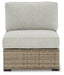 This cool, casual outdoor chair will raise the comfort level and visual appeal of your outdoor living space. Made of handwoven wicker in easy-going beige tones, the cushioned armless chair blends beautifully into your lanai or pool and patio area with thick, comfy cushions wrapped in Nuvella® high performance fabric that is stain resistant, fade resistant and easy to clean. This outdoor chair can be used on its own or paired with other pieces of the matching sectional to create a space that holds up to Mother Nature and ages gracefully for years of enjoyment.