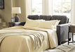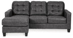 This ultra-contemporary sofa sleeper invites you to spread out and make yourself comfortable. Linear track arms offer a clean, sleek aesthetic, while tufted box cushions are a nod to mid-century design. Rest assured, a movable ottoman and reversible seat cushions allow you to place the chaise on either side for the perfect fit. Gunmetal gray faux leather offers the cool, weathered look you love and touchably soft feel you crave. Pull-out queen mattress in quality memory foam comfortably accommodates overnight guests.