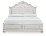 Transform your inner sanctum into a haven of timeless elegance. This traditionally inspired queen upholstered panel bed features a cushioned headboard embellished with a serpentine-shaped crown and light pearl gray upholstery. A contoured footboard with picture frame moulding completes the ageless aesthetic. And did we mention the classic antiqued white finish and stylish reeded bun feet? Talk about relaxed refinement.