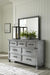 What's old is what's new with this dresser and mirror. Serving up a fresh look in urban-farmhouse style, the eclectic dresser features a light weathered gray finish with dark aged bronze-tone bar pulls and metal straps for a casually cool sensibility. Profiled drawer frames, thick-profiled top moulding and tapered legs are the earmarks of timeless design.
