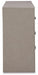 Love sleek and bold contemporary style? Drink in the beauty of this dresser. Its eye-catching details include glam glitter accents and the look of leather grain with a subtle gray finish. Large-scale linear handles, in a sophisticated champagne chrome tone, play perfectly with the streamlined aesthetic. This storage piece is a simply stunning way to achieve the bedroom of your dreams.