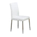 Clean lines enhance the modern aura of this everyday dining side chair. Beautifully appointed, this modern chair features an armless profile with a slightly curved back for superb comfort. Horizontal stitching crosses its seat back while a comfortable seat features smooth upholstery. White leatherette is easy to maintain and offers sleek, bright appeal. Thin legs are complemented with a gleaming chrome finish. Includes: Four (4) side chairs