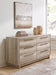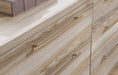 Modern meets neutral and sophisticated in this dresser. Its natural finish, subtle replicated wood grain and clean lines wake up your bedroom with eye-catching appeal. The generous storage space in its smooth-gliding, lined drawers brings function to relaxed refinement. Elongated handles in a champagne tone speak casual simplicity, creating a smart and stylish bedroom retreat.