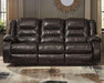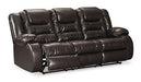 When it comes to comfort, style and value, this faux leather reclining sofa in chocolate brown rocks. Tailored for feel-good flair, its fashion-forward bustle back design is enhanced with sculpted padding on the headrest for cradling support. Channel cushioning along the sides flows into thick, wrapped pillow top armrests that are truly over the top. And while it might look like you broke the bank, a sumptuously soft leather-like fabric keeps indulgence well within budget.