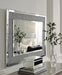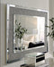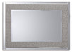 Subtle glitz and glam are in reach with this accent mirror. Beautifully crafted with a cut glass outer frame with delicate crystal beading on the inner frame. The beveled center mirror floats inside the frame adding a soft sparkle to any room.