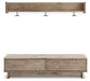 This stylish and versatile storage bench with wall-mounted coat rack are ideal additions to your entryway or mudroom. The dry, light finish with replicated oak grain and authentic touch is accented with brushed nickel-tone pulls as well as hooks on the coat rack for hats and handbags. Two spacious drawers provide endless options for storage while the coat rack features an open shelf for easy access or display. Wall mounting bracket included.