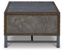 Reinvented for the here and now, this lift-top coffee table rocks vintage industrial design with a traditional vibe. Its metal accent trim and bronze-tone metal base frame are ready to embrace the modern demands of everyday life. Two spacious storage bins provide additional storage, while the center lift top transforms into a casual work center or extra dining space when needed.