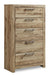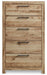 Inspired by natural beauty, refined to perfection. This chest of drawers brings cozy outdoor vibes to your bedroom with its warm and inviting golden rustic finish. Handles in an antiqued gunmetal hue adorn the five drawers on its framed front, adding an industrial touch to the simple, streamlined design.
