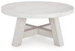 Carefully crafted with farmhouse appeal, this coffee table features braced posts and a thick round tabletop. The off-white finish adds depth and character to its simple silhouette. You won't be able to resist the organic appeal of this versatile piece.