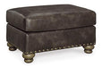 Enticing with a coffee brown faux leather, beautified with a gently weathered effect and designer stitching, this ottoman merges a richly traditional sense of style with modern comfort. Turned bun feet and prominent nailhead trim incorporate distinctive character.