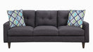Relax on this stationary sofa that has clean lines and style that's sure to satisfy. Seat cushions are plush for hours of enjoyment watching anything from Netflix to the playoffs. Thick, button-tufted seat backs add timeless style as well as comfort and support. Round tapered legs and wide arm supports impart sturdiness and convenience all in one. Wrapped in dark grey fabric that appeals to even the most discerning homeowner. Includes: One (1) sofa