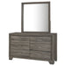 Complete your bedroom storage ensemble with the roomy space in this transitional six-drawer dresser with a framed mirror that attaches directly to the back of the dresser. It boasts a brown oak wood grain finish over laminate surfaces, creating a stylish look that resists everyday wear and tear. The dresser delivers roomy storage in drawer with smooth metal glides and bar pulls, adding the perfect hint of contrast and depth. Mitered trim adorns the front of the case and complements the frame on the mirror to create a sense of angular precision. Use the wide top for a jewelry box and a vase of flowers, or select decor that brings personalized aesthetics to your inviting bedroom.