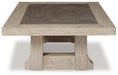A striking example of rustic refinement, this coffee table is generously scaled to accommodate your entertainment needs with ease. Made with pine wood and veneer beautified with a complex bisque finish, this designer coffee table includes a top with melamine inset for mixed-media interest.